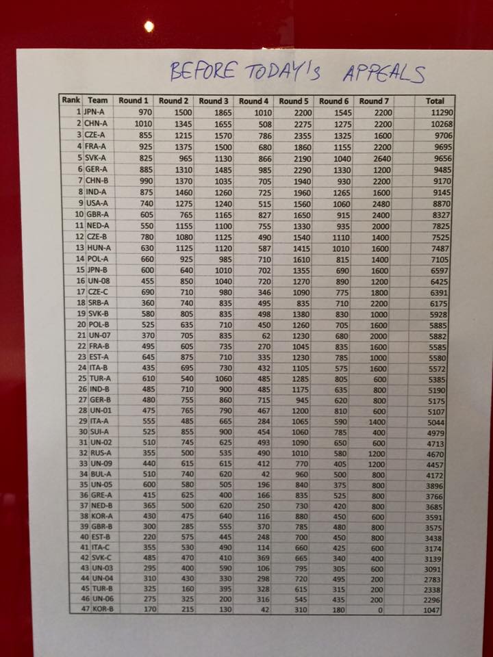RE: WSC 2015 - usp - 13.10.2015 Während Sofia sich eher grau präsentiert, rauchen drinnen schon wieder die Köpfe ... Die sechs Runden von gestern sind auch bereits korrigiert - Zwischenstand: Michael 6 (Plätze 1-10 kommen in die Play-offs heute Nachmittag!) Florian 17 Martin 24 Sebastian 25 Philipp 80 Nicole 87 Robert 88 Thomas 90 Jens 109 RE: WSC 2015 - Eisbär - 13.10.2015 Ola! Gibt es vielleicht einen vollständigen Zwischenstand? Und gibt es einen "live-Blog" oder so? Ich kann ganz nichts wiederfinden... war am liebsten "live" dabei gewesen! (bin nicht in Bulgarien wegen einen Bauchoperation letzter Woche) LG aus Holland, Arvid a.k.a. Eisbär RE: WSC 2015 - Realshaggy - 13.10.2015 Hier der Stand von heute morgen. Scheint dieses Jahr schwierig zu sein, an Infos zu kommen. RE: WSC 2015 - Eisbär - 13.10.2015 Es ist schwierig... stimmt ![]() Danke Christoph! Arvid RE: WSC 2015 - usp - 13.10.2015 Teamplatzierungen: GER-A auf 6 und GER-B auf 27 (von 47, glaube ich) Eine (von drei) Team-Runden wurde heute Vormittag gestrichen. Dummerweise genau die Killer-Runde, für die unsere Teams gestern Abend noch trainiert haben. Beschwerden gab es hier auch über die bunten Stifte in den Team-Runden, die schlecht schrieben. Wir warten jetzt auf die Ergebnisse der Runden von heute und sind gespannt, ob die Play-offs wie vorgesehen um 15 Uhr starten können. Worauf wir auch noch warten, ist das WPC Instruction Booklet ... Das mutiert hier zum Dauergag mittlerweile. RE: WSC 2015 - Realshaggy - 13.10.2015 Keine Panik, sind ja noch fast zwei Tage Zeit. RE: WSC 2015 - berni - 13.10.2015 (13.10.2015, 13:23)usp schrieb: Worauf wir auch noch warten, ist das WPC Instruction Booklet ... Das mutiert hier zum Dauergag mittlerweile. Aber immerhin, ihr habt Internet. Das ist doch schon mal was...