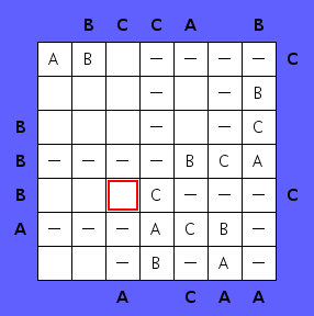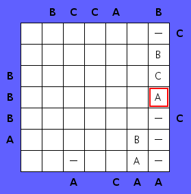 Und weil das so gut ging, machen wir gleich mit dem B in der nächsten Spalte weiter (ich gebe zu, dass das nicht ganz so einfach zu sehen ist): In der fünften Spalte kann das B offensichtlich nur in einer der drei Zeilen stehen, wo links am Rand ein B steht. In der untersten dieser beiden erhält man sofort einen Widerspruch, weil nach rechts hin nicht mehr genügend Platz ist und bei der obersten müsste man rechts daneben ein A eintragen, was auch nicht geht. Bleibt also die Mitte und man erhält:
