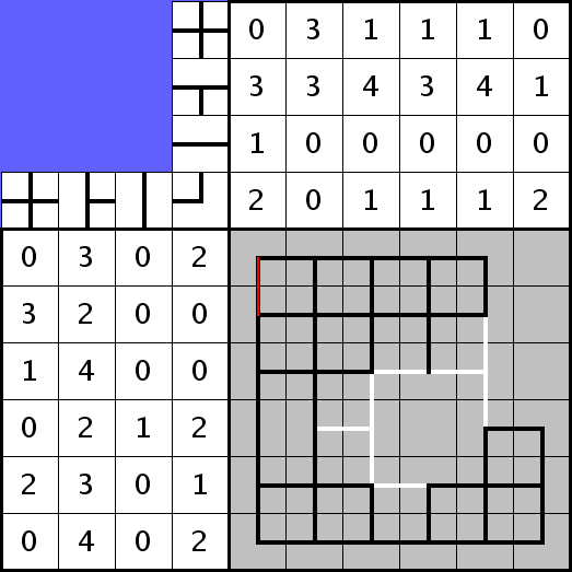 4. Jetzt wird es Zeit, nach weiteren Leerfeldern zu suchen: In der vierten Spalte befinden sich eine Kreuzung, drei T-Stücke und ein Knick, macht zusammen 5 Felder. Ein Feld bleibt in dieser Spalte also leer. Mit Ausnahme der rechten Spalte, wo wir die drei Leerfelder bereits kennen, sind alle anderen Spalten komplett gefüllt. Jetzt müssen wir einfach noch am linken Rand die Zeilen zusammenzählen und stellen fest, dass die obersten vier Zeilen jeweils 5 Felder enthalten, die untersten beiden 6. Es fehlt also nur noch ein Leerfeld und dieses muss sich in Zeile 4, Spalte 4 befinden.