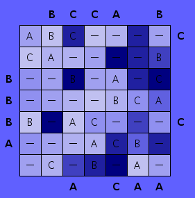 Und weil das so gut ging, machen wir gleich mit dem B in der nächsten Spalte weiter (ich gebe zu, dass das nicht ganz so einfach zu sehen ist): In der fünften Spalte kann das B offensichtlich nur in einer der drei Zeilen stehen, wo links am Rand ein B steht. In der untersten dieser beiden erhält man sofort einen Widerspruch, weil nach rechts hin nicht mehr genügend Platz ist und bei der obersten müsste man rechts daneben ein A eintragen, was auch nicht geht. Bleibt also die Mitte und man erhält: