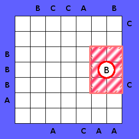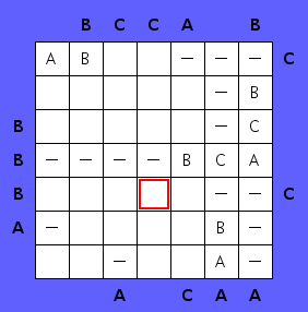 Und weil das so gut ging, machen wir gleich mit dem B in der nächsten Spalte weiter (ich gebe zu, dass das nicht ganz so einfach zu sehen ist): In der fünften Spalte kann das B offensichtlich nur in einer der drei Zeilen stehen, wo links am Rand ein B steht. In der untersten dieser beiden erhält man sofort einen Widerspruch, weil nach rechts hin nicht mehr genügend Platz ist und bei der obersten müsste man rechts daneben ein A eintragen, was auch nicht geht. Bleibt also die Mitte und man erhält: