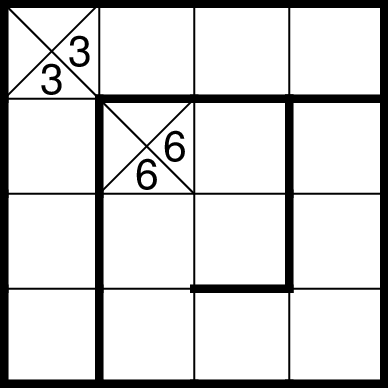 Für mich ist es falsch, weil die vom Löser gewählte Notation auf der Abgrenzung von Gebieten durch Gitterlinien beruht. Eine nicht vollendete Trennlinie hinterlässt in diesem Sinne weder 1 einziges Gebiet noch 2 separate, sondern irgendwas dazwischen. Das heißt, die Lösung ist noch nicht fertig. Und somit falsch. Man könnte auch argumentieren: - Auf den beiden Seiten jeder Trennlinie liegen zwei unterschiedliche Gebiete. => Falsch. - Das Gebiet hängt zusammen und hat die richtige Form. => Richtig. Vielleicht würden weitere Beispiele helfen, die wesentlich extremere Situationen aufweisen (in beide Richtungen: fast richtige Lösungen und fast falsche Lösungen). @HuDu: Bei 'Abstandsgebieten' sind innere Teilkanten auch nicht explizit durch die Regeln verboten, aber wenn sie erlaubt wären, könnte man leicht weitere Lösungen finden: http://wiki.logic-masters.de/index.php?t...gebiete/de @Hausigel: Dein Beispiel finde ich inhaltlich nicht gleichwertig, weil die Verbindungslinien im Inneren des Gebiets in Bernis Beispiel eine Verbindung zum Rand haben, in deinem Beispiel aber echt im Gebiet liegen.