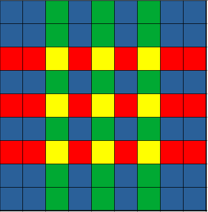 Then you can define the Green (G) set as intersecting cells of complementary rows and complementary columns (rows and colmuns 34567 in our example).
