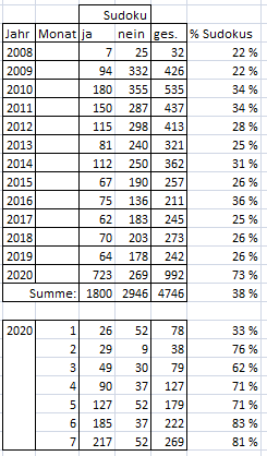 "dass die Anzahl an Nicht-Sudokus absolut gesehen gar nicht mal geringer ist als in den letzten Jahren (möchte das mal zufällig jemand nachprüfen?"