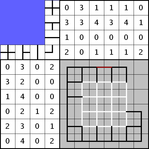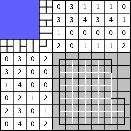 4. Jetzt wird es Zeit, nach weiteren Leerfeldern zu suchen: In der vierten Spalte befinden sich eine Kreuzung, drei T-Stücke und ein Knick, macht zusammen 5 Felder. Ein Feld bleibt in dieser Spalte also leer. Mit Ausnahme der rechten Spalte, wo wir die drei Leerfelder bereits kennen, sind alle anderen Spalten komplett gefüllt. Jetzt müssen wir einfach noch am linken Rand die Zeilen zusammenzählen und stellen fest, dass die obersten vier Zeilen jeweils 5 Felder enthalten, die untersten beiden 6. Es fehlt also nur noch ein Leerfeld und dieses muss sich in Zeile 4, Spalte 4 befinden.